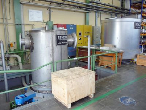 | Beschreibung: | Zustand: sehr gut - wurde nur ca. 10 x benutzt zum Glühen von Hochvolt-Kondensatorfolie aus Aluminium, bestehend aus: Sockel mit Ventilator Schutzhaube Chargiergestell Glühhaube Kühlhaube aus VA 4 Stromsteuerschränken Gassteuerung Vakuumpumpe Kühlwasserrecycling Nutzabmessungen: Ø 1400 mm, Höhe 1800 mm Temperatur max.: 650 °C Besatzgewicht: ca.1200 kg Anschlußwerte Elektrische Energie: ca. 265 kVA Kühlwasser (Filterwasserqualität) bei 25°C Temperaturerhöhung: ca. 1,5 m³/h Kühlwasser (Industriewasserqualität) bei 25°C Temperaturerhöhung: ca. 7,0 m³/h Schutzgas (Stickstoff, Argon): ca. 9,0 m³/h (im Durchschnitt, je nach Glühart, Glühmaterial, Restschmiermittelmenge etc.) Spezifische Verbrauchszahlen Elektrische Energie:ca. 820 kWh/t Kühlwasser (Filterwasserqualität): ca. 13,4 m3/t Kühlwasser (Industriewasserqualität): ca. 17,5 m3/t Schutzgas: ca. 65 m³/t je nach Restschmiermittelmenge Erforderliche Betriebsstoffe Elektrische Energie: Anschlußspannung: DS 380 V + 5 %; 50 Hz Steuerspannung: WS 220 V + 5 %; 50 Hz Anspeiseüberdruck: 0,3 bar Kühlwasser (Filterwasserqualität): Reinheit: max. 10 mg/l Sinkstoffe Filtergrad: max. 0,3 mm Maschenweite Analyse: Das Kühlwasser darf an den Kühlwasser-Kontakt- flächen keine Korrosion hervorrufen. Entspricht das Kühlwasser nicht dieser Forderung, empfehlen wir den Einsatz einer Wasserrückkühlanlage mit Plattenwärmetauscher, um die Kühlwasser-Kontakt- flächen vor Korrosion zu schützen. Kühlwasser (Industriewasserqualität): Sinkstoffe: grob gefiltert Analyse: siehe Filterwasserqualität Kühlwasserüberdruck bei max. Kühlwasserentnahme: min. 2 bar Kühlwasserüberdruck bei min. Kühlwasserentnahme: max. 3,5 bar max. Kühlwassereintrittstemperatur: 20°C Die Kühlwasserkreise haben freien Ablauf. Die Sockelkühlung (Filterwasserqualität) muss auch bei Stromausfall gewährleistet sein. Stickstoff, Argon oder Preßluft: in der für das Glühverfahren erforderlichen Reinheit Preßluft: wasser-, öl- und staubfrei Anspeiseüberdruck: min. 4 bar, max. 6 bar Mindestkrantragfähigkeit: 4.300 kg Empfohlene Kran- und Krankatzengeschwindigkeiten: 20/5 m/min Empfohlene Hubgeschwindigkeiten: 4/0,5 m/min Bedienungspersonal: Für die Chargierung und Dechargierung sowie das Umsetzen der Anlage sind in Abhängigkeit von der Charge ca. 6 Mann-Stunden je Schicht erforderlich bzw. gelten die entsprechenden örtlichen Sicherheitsvorschriften. Der Ablauf des Glüh- bzw. Kühlzyklus erfolgt automatisch, der Bedienungsmann muss jedoch zur Sicher- heitskontrolle die Einschalt- bzw. Ausschaltbedingungen manuell schaffen, d.h. die erforderlichen Ventilbetätigungen vornehmen und die Medien-Steckverbindungen herstellen. Personal für die Inspektion und Wartung wird fallweise nach Bedarf benötigt. Allgemeine Bedingungen: Die elektrischen Anlagen werden unter Einhaltung der in der BRD geltenden VDE-Vorschriften betreffend elektrische Ausrüstungen ausgeführt. |
